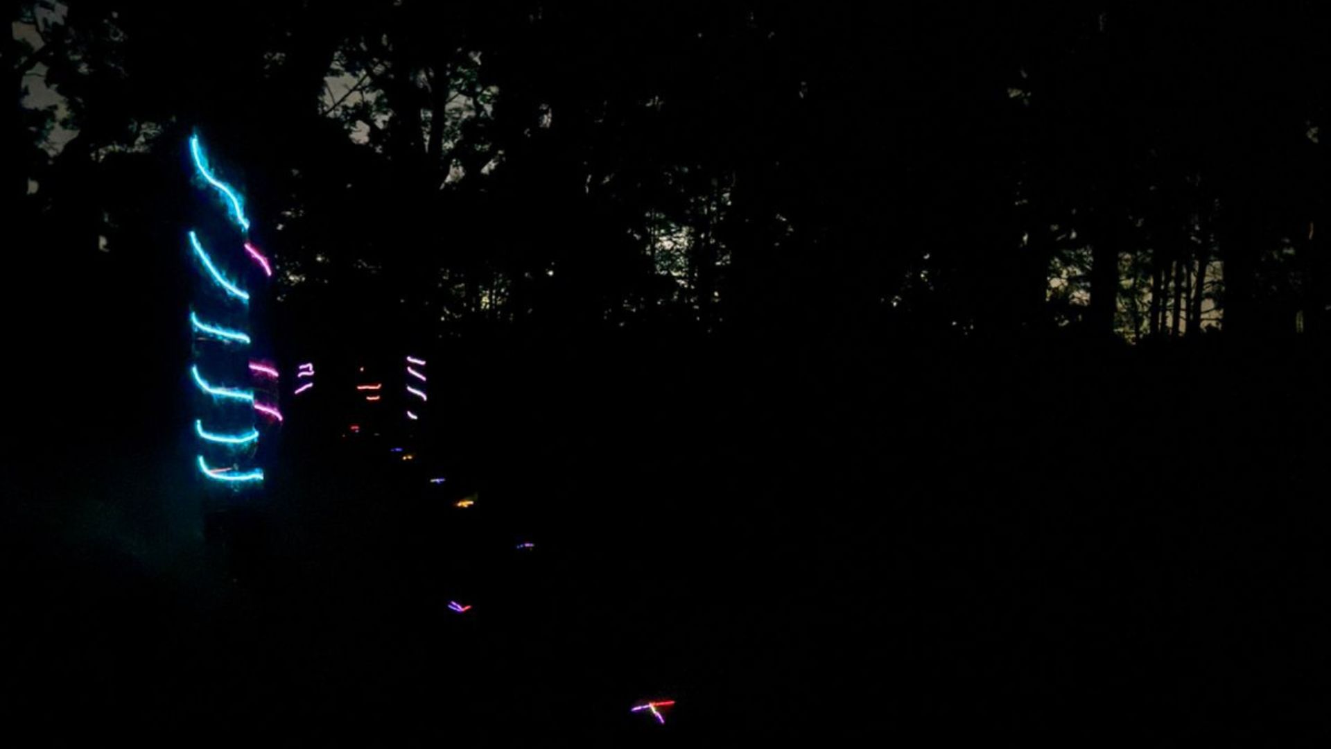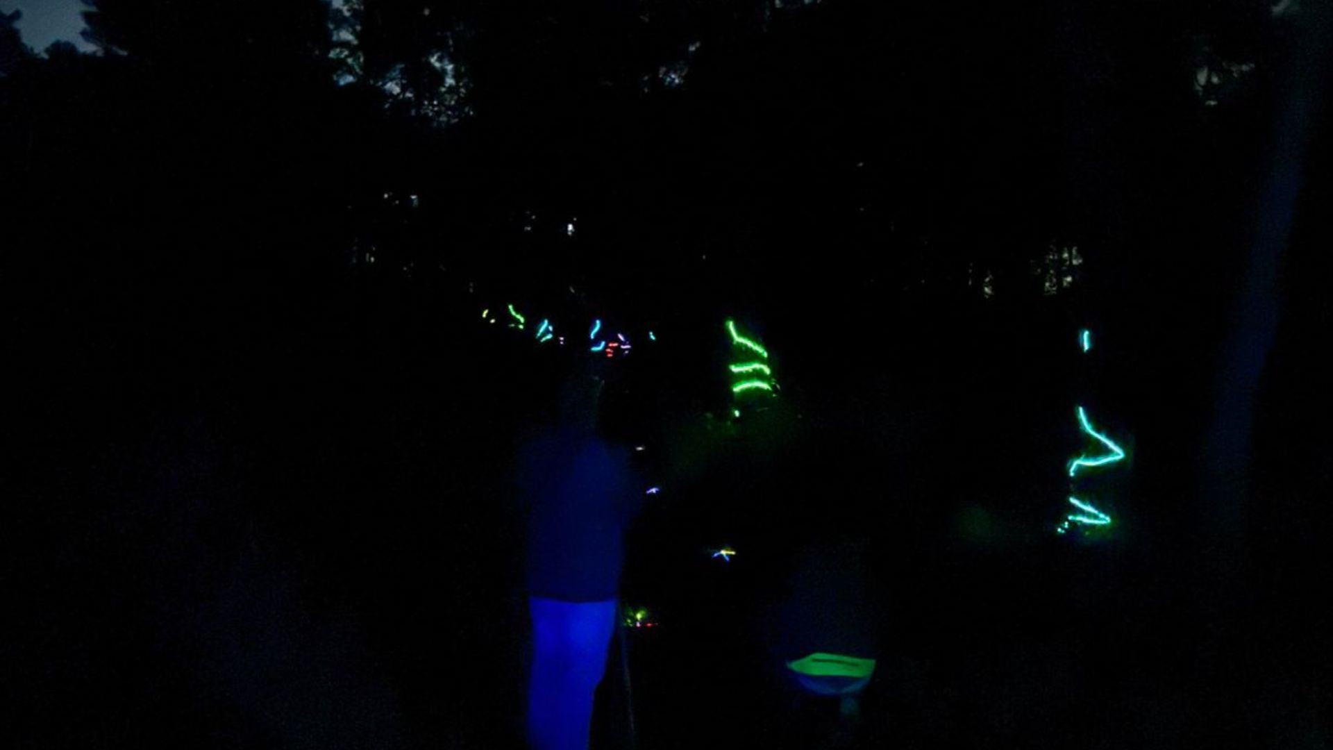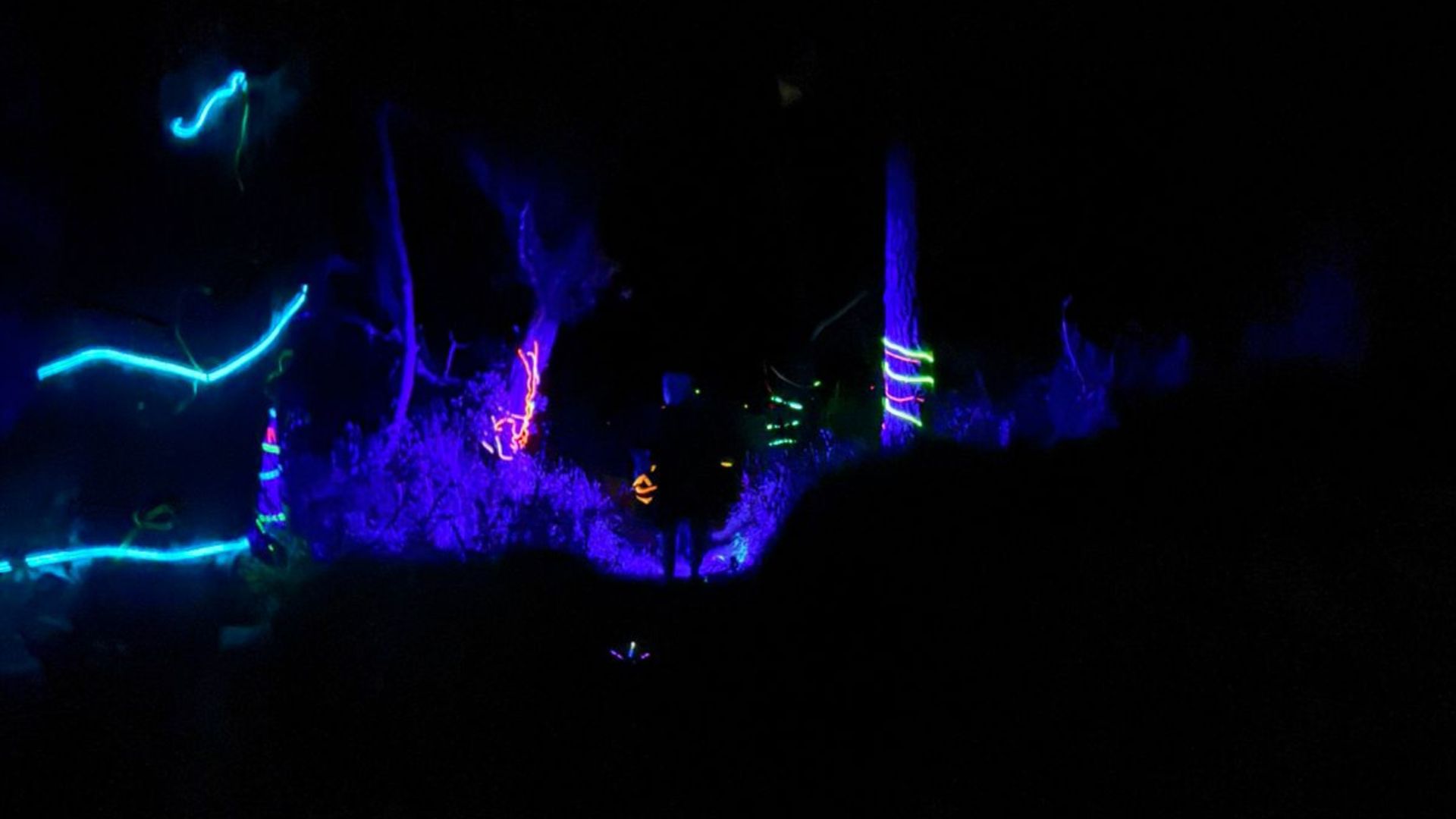 Atravesarás un sendero donde árboles y camino están marcados con neones.