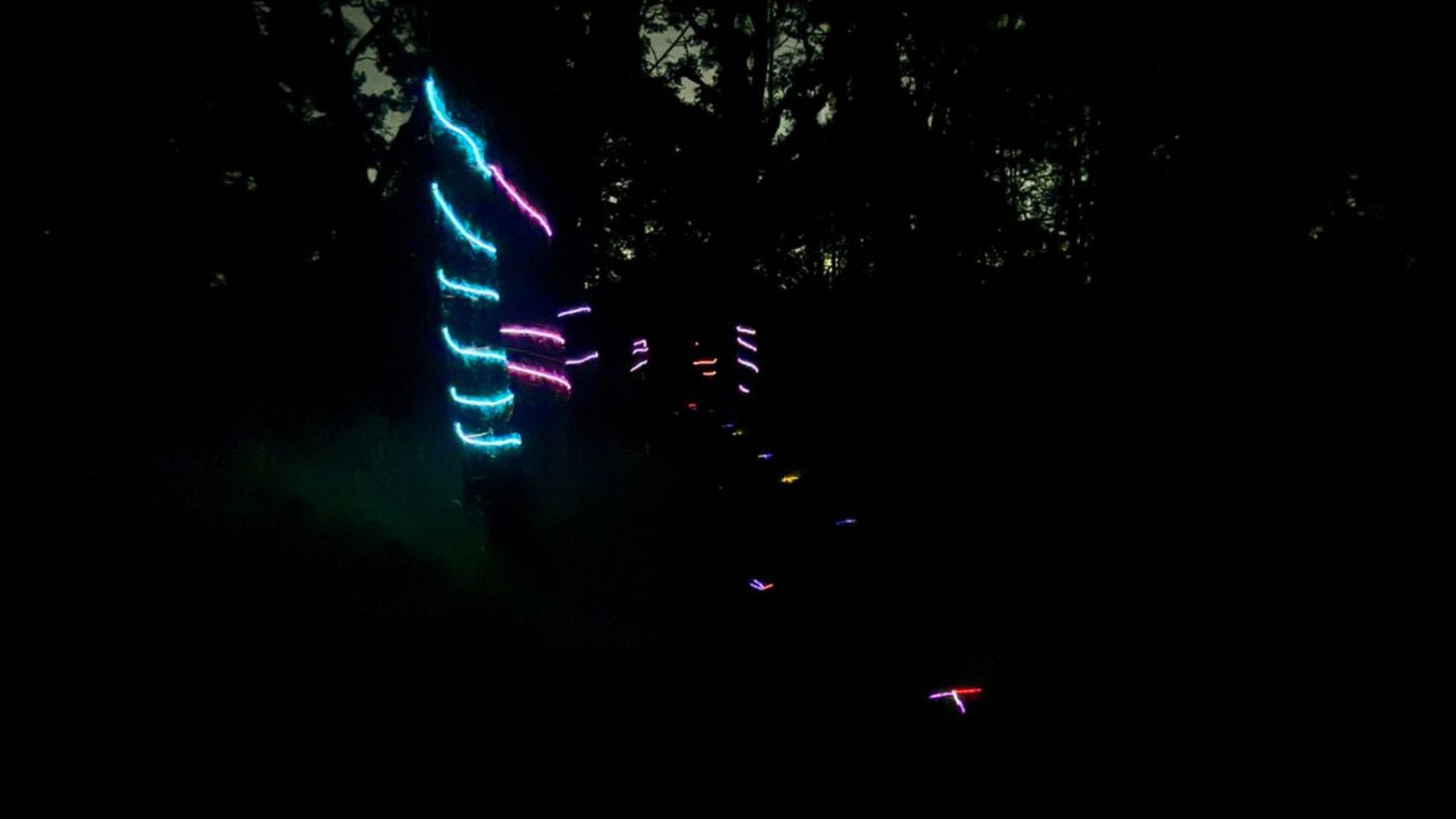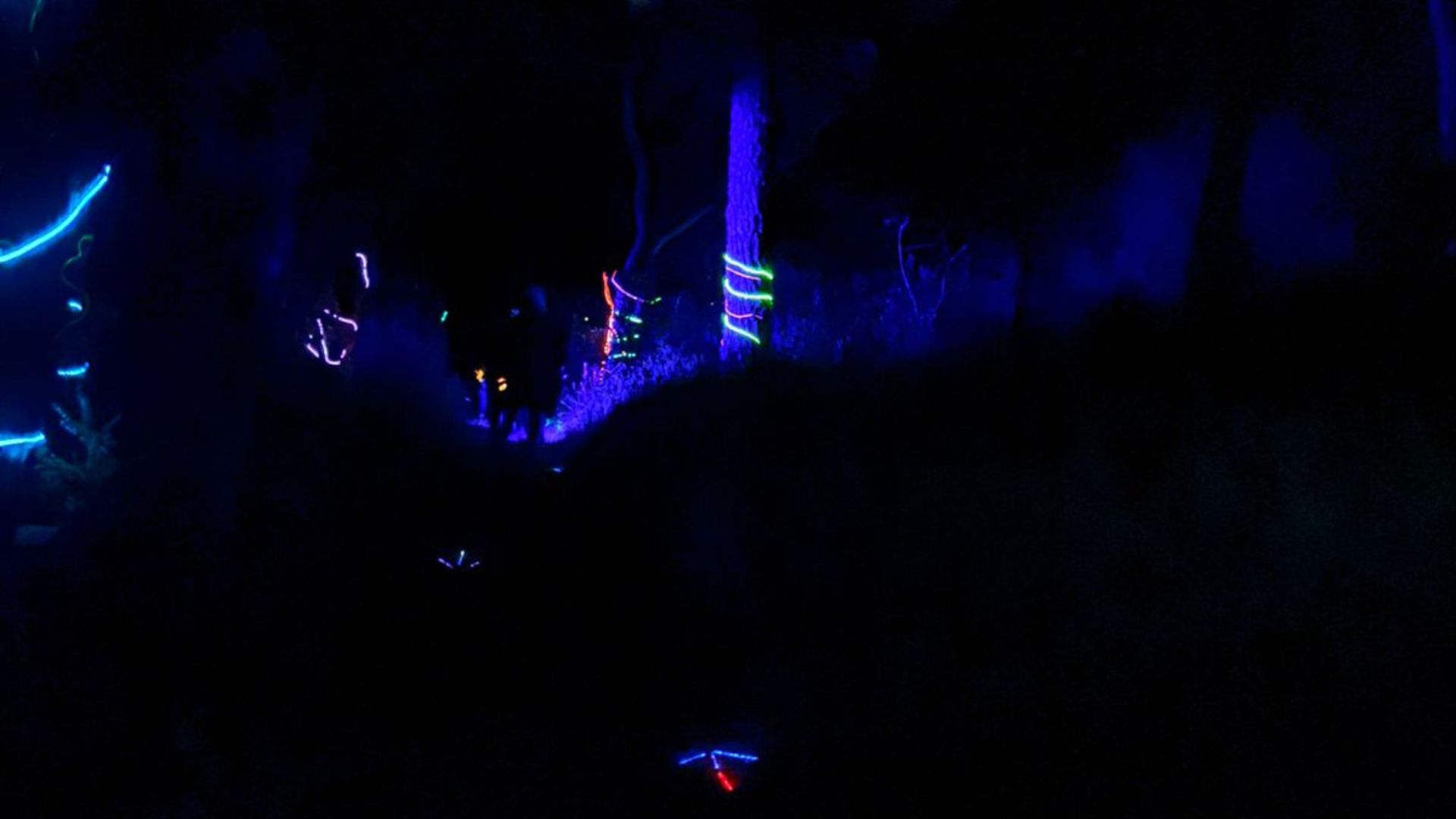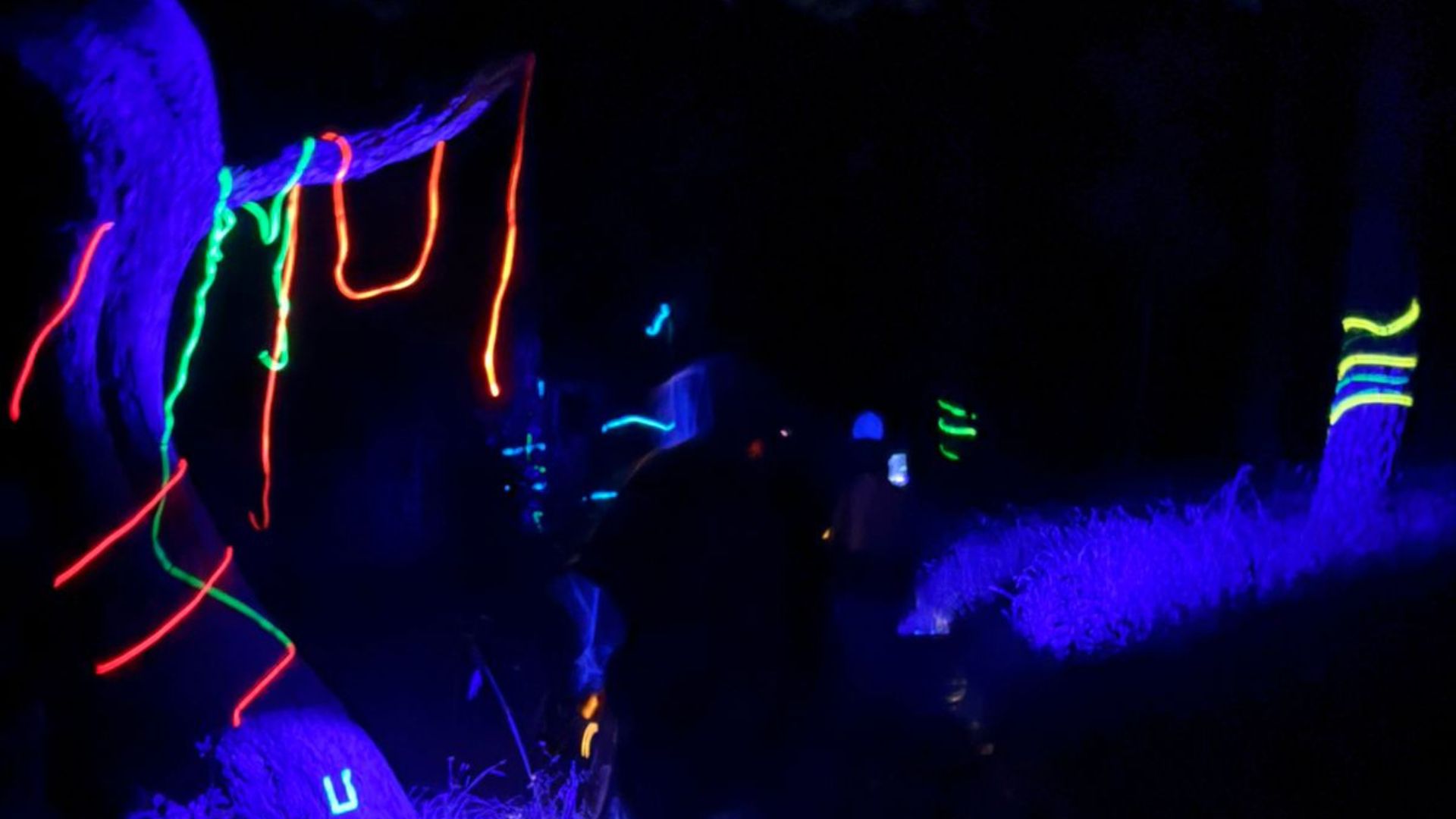 Atravesarás un sendero donde árboles y camino están marcados con neones.